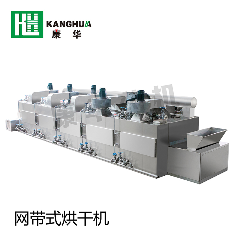 網(wǎng)帶式干燥機(jī)工作時(shí),冷空氣通過熱交換器進(jìn)行加熱,采用科學(xué)合理循環(huán)方式,使熱空氣穿流通過網(wǎng)帶上的被干燥物料進(jìn)行均勻的熱質(zhì)交換,整機(jī)各單元內(nèi)熱氣流在循環(huán)風(fēng)機(jī)的作用下進(jìn)行熱風(fēng)循環(huán),排出低溫高濕度的空氣。平穩(wěn)高效地完成整個(gè)干燥過程。