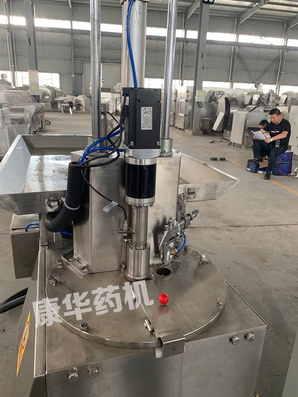 工作原理:將物料放入相應(yīng)進(jìn)料斗,氣缸自動(dòng)壓料,切刀固定于轉(zhuǎn)盤正面,轉(zhuǎn)盤與切刀的合適間隙通過(guò)伺服電機(jī)控制刀盤上下調(diào)節(jié),當(dāng)電機(jī)帶動(dòng)刀盤,將物料切成片狀。配有水槍噴霧裝置,使刀片切制藥材不容易粘刀,片形更好。