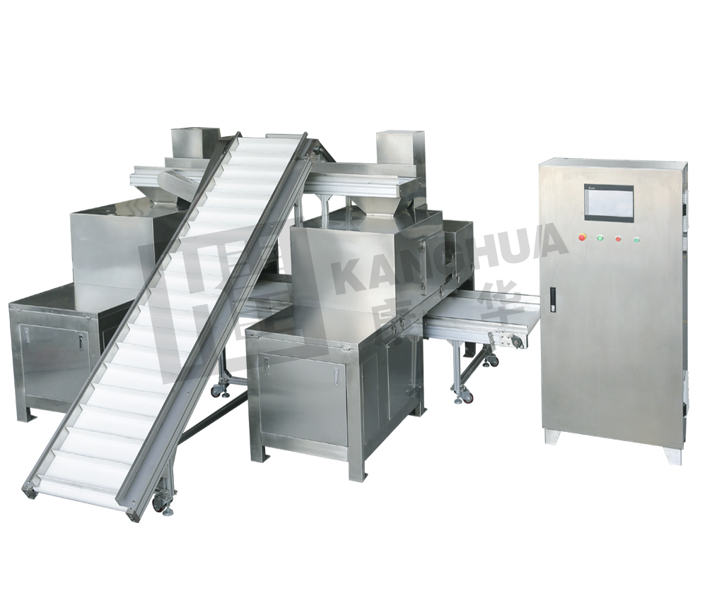 將兩臺(tái)單獨(dú)的刨片機(jī)組合,實(shí)現(xiàn)上料,分流,稱重,切制,出料全自動(dòng)的生產(chǎn)過程。進(jìn)料端設(shè)有輸送式儲(chǔ)料箱,可以儲(chǔ)存較大量原物料,減少人工加料次數(shù)。運(yùn)行全程由PLC微電腦控制操作,具有連續(xù)作業(yè)、能耗低、產(chǎn)量高等優(yōu)點(diǎn)。符合GMP要求。